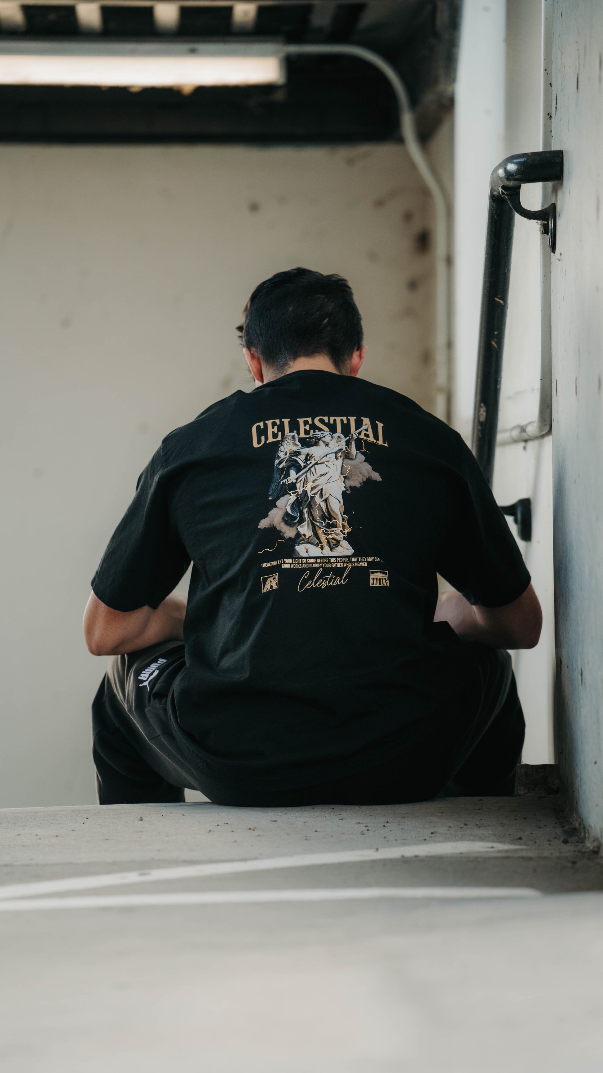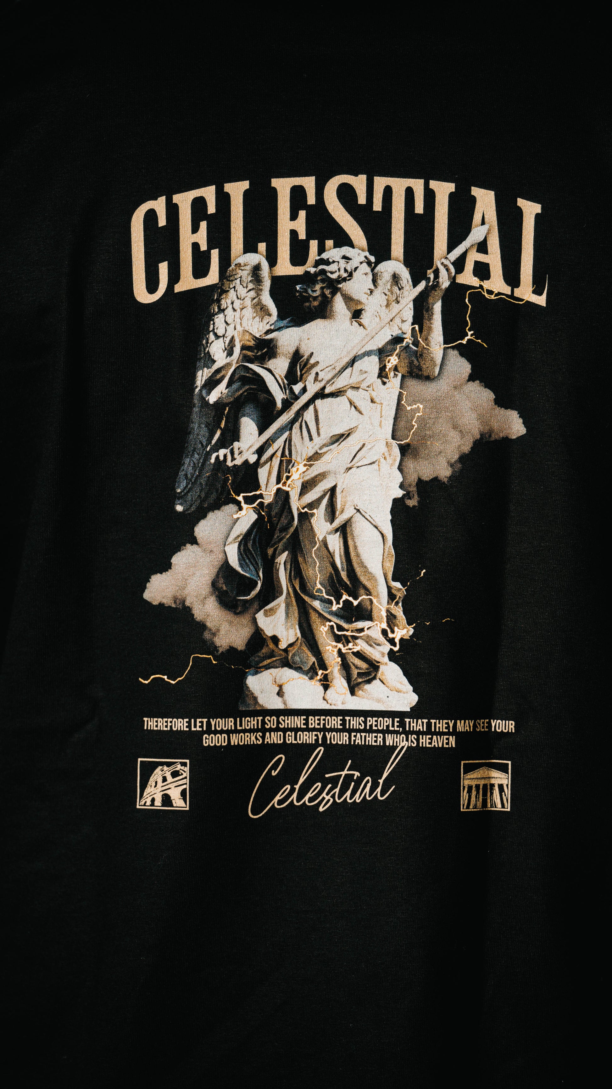 The focal point of this extraordinary tee is its mesmerizing design on the back – a depiction of an angelic statue surrounded by lightning bolts. Symbolizing divine guidance and protection, this image serves as a beacon of strength and inspiration, reminding us of the heavenly forces at work in our lives.
